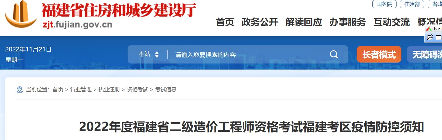 福建省住建廳發(fā)布了2022年二級(jí)造價(jià)師考試疫情防控須知,要求考試當(dāng)天①考試當(dāng)天體溫檢測(cè)正常(低于37.3℃)。②掃考點(diǎn)(校園)場(chǎng)所碼,本人動(dòng)態(tài)“福建健康碼”為綠碼、“行程卡”無(wú)異常狀態(tài)。③提供本人首場(chǎng)考試考前48小時(shí)內(nèi)【福州、泉州、南平考區(qū)全體考生及廈門(mén)考區(qū)(7天內(nèi)有省外及省內(nèi)涉疫地區(qū)旅居史的考生)為本人首場(chǎng)考試考前24小時(shí)內(nèi)】核酸檢測(cè)陰性報(bào)告。④考前8天內(nèi)無(wú)境外、考前5天內(nèi)無(wú)國(guó)內(nèi)高風(fēng)險(xiǎn)區(qū)旅居史。
