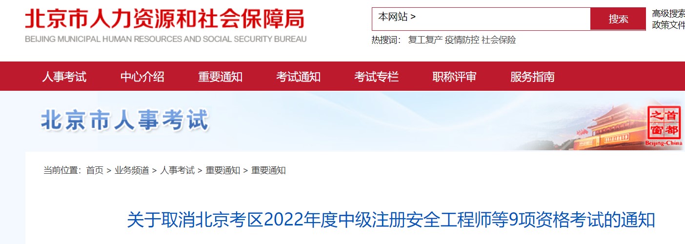關(guān)于取消北京考區(qū)2022年度中級(jí)注冊(cè)安全工程師等9項(xiàng)資格考試的通知