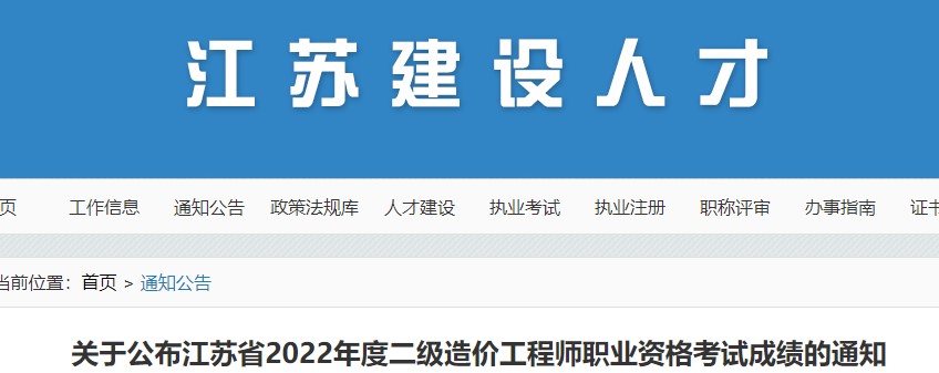 關(guān)于公布江蘇省2022年度二級(jí)造價(jià)工程師職業(yè)資格考試成績(jī)的通知