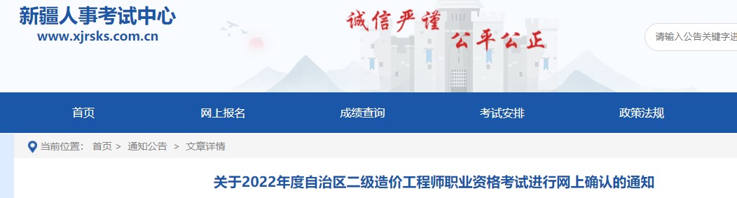 根據(jù)自治區(qū)人力資源和社會(huì)保障廳、自治區(qū)住房和城鄉(xiāng)建設(shè)廳、交通運(yùn)輸廳、水利廳相關(guān)工作要求,現(xiàn)將2022年度自治區(qū)二級(jí)造價(jià)工程師職業(yè)資格考試進(jìn)行網(wǎng)上確認(rèn)有關(guān)事項(xiàng)通知如下: