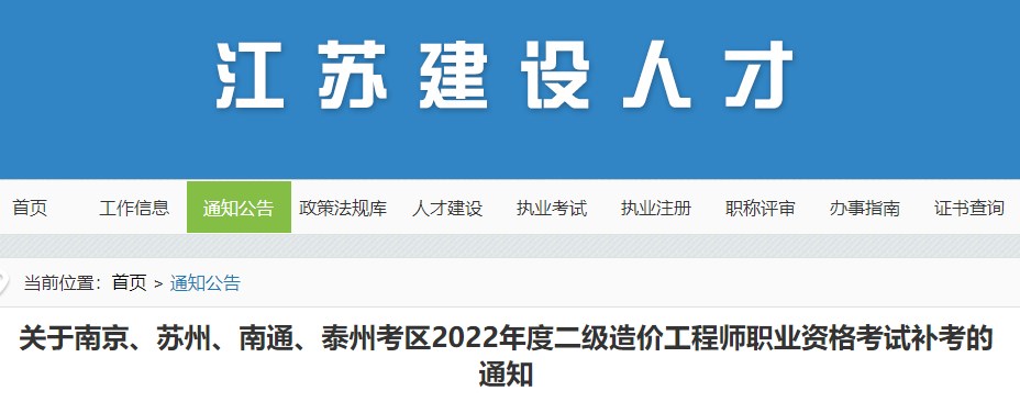關(guān)于南京、蘇州、南通、泰州考區(qū)2022年度二級造價工程師職業(yè)資格考試補考的通知
