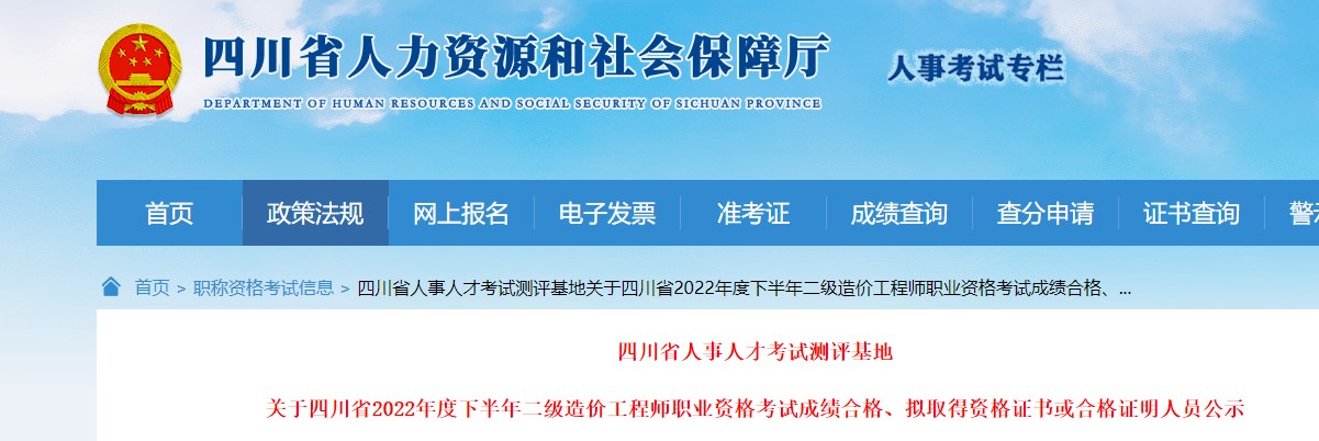 關(guān)于四川省2022年度下半年二級(jí)造價(jià)工程師職業(yè)資格考試成績合格、擬取得資格證書或合格證明人員公示