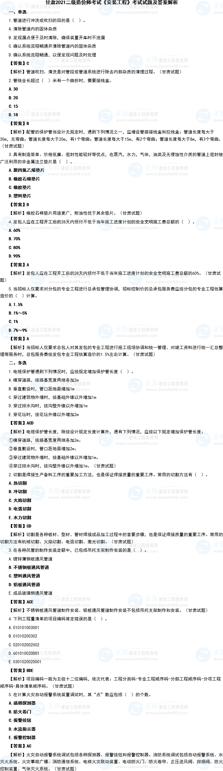 甘肅2021二級造價師考試《安裝工程》考試試題及答案解析