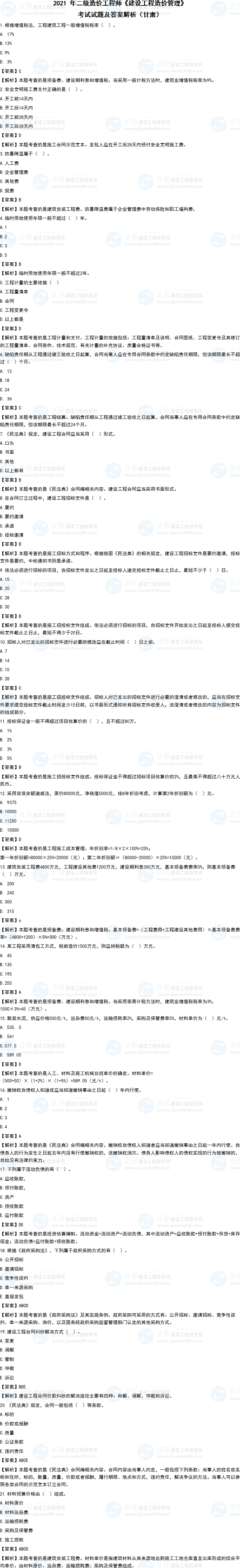 甘肅2021二級(jí)造價(jià)師考試《造價(jià)管理》考試試題及答案解析