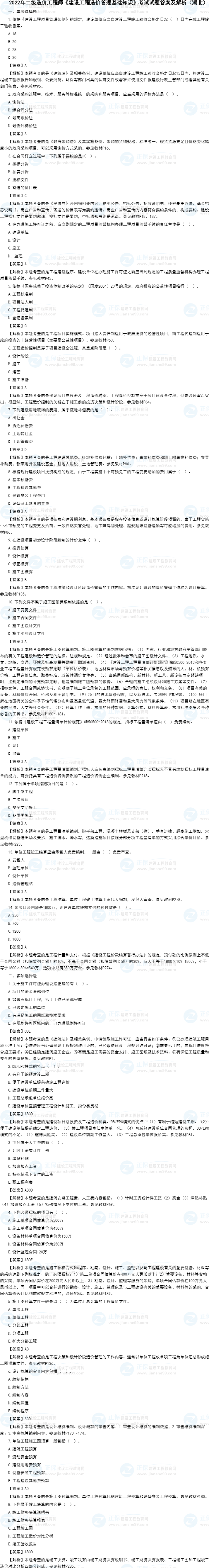 湖北2022年二級(jí)造價(jià)工程師《造價(jià)管理基礎(chǔ)知識(shí)》考試試題及答案解析