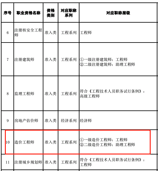 其中,對(duì)于取得一級(jí)注冊(cè)結(jié)構(gòu)工程師、一級(jí)建筑師、一級(jí)建造師或一級(jí)造價(jià)師資格的人員,可聘任工程師職務(wù);對(duì)于取得二級(jí)注冊(cè)結(jié)構(gòu)工程師、二級(jí)建筑師、二級(jí)建造師或二級(jí)造價(jià)師資格的人員,可聘任技術(shù)員或助理工程師職務(wù)。