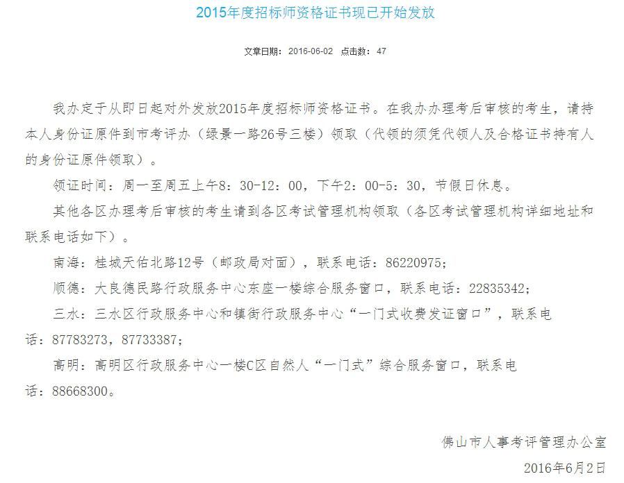 摘要:2015年佛山招標師證書已經(jīng)開始發(fā)放,領證時間:周一至周五上午8:30-12:00,下午2:00-5:30,節(jié)假日休息;領證地點:市考評辦(綠景一路26號三樓),其他各區(qū)辦理考后審核的考生請到各區(qū)考試管理機構領取。