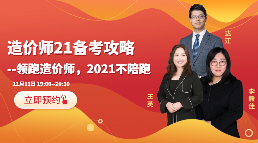 2020年一級(jí)造價(jià)師考試已經(jīng)結(jié)束,2021年一級(jí)造價(jià)師考試備考可以開(kāi)始了!在新的一年怎么備考呢?2021年一級(jí)造價(jià)師考試不陪考,11月11日,在直播間王英、李毅佳、達(dá)江做客,等你!與你們不見(jiàn)不散!