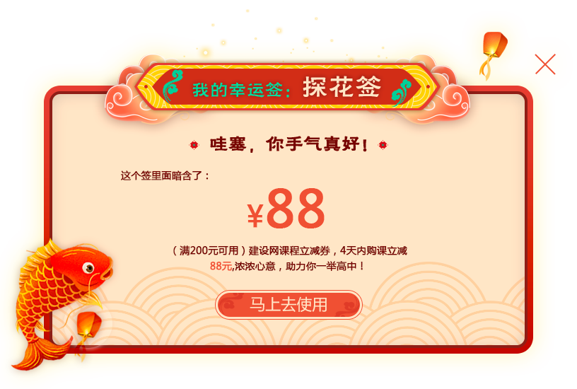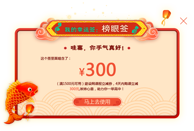 親愛的,在活動時間內(nèi)點擊【抽簽】可立刻抽取你的幸運(yùn)簽,每種簽代表的是一種祝福和相應(yīng)金額的一建課程優(yōu)惠券或免費(fèi)課。已經(jīng)抽到的簽可點【我的】查看。