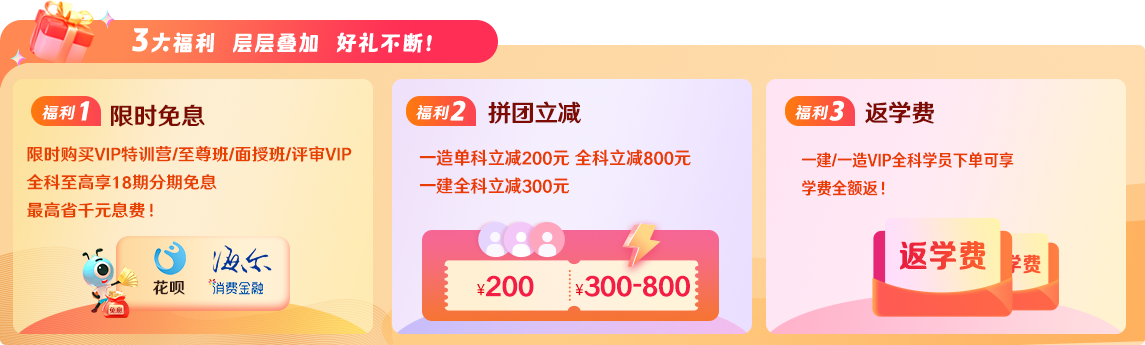 2.課程優(yōu)惠:2026年一建、二建、一造、監(jiān)理、咨詢、房估、安全、經(jīng)濟師、評估師新課7.5折;2025年一建、二建、一造、監(jiān)理、咨詢、房估、安全、經(jīng)濟師課程8.5折。全場保價11·11,可與VIP會員折扣同享。