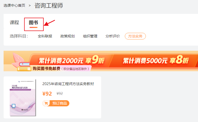 電腦端:進(jìn)入網(wǎng)校首頁(m.mm34228.com)-進(jìn)入“選課中心”-選擇“咨詢工程師”-選擇“圖書”-選擇要購買的科目即可。