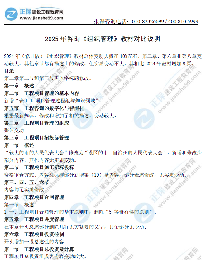 2025年咨詢工程師教材已發(fā)行,發(fā)行為2024修訂版教材,正保建設工程教育網(wǎng)教研團隊第一時間為大家進行教材解析,其中《組織管理》教材總體變動大概在10%左右,第二章、第六章和第八章變動較大,其他章節(jié)都有描述上的修改,但實質變動不大,其相比2024年教材增加8頁。具體各章節(jié)變化如下: