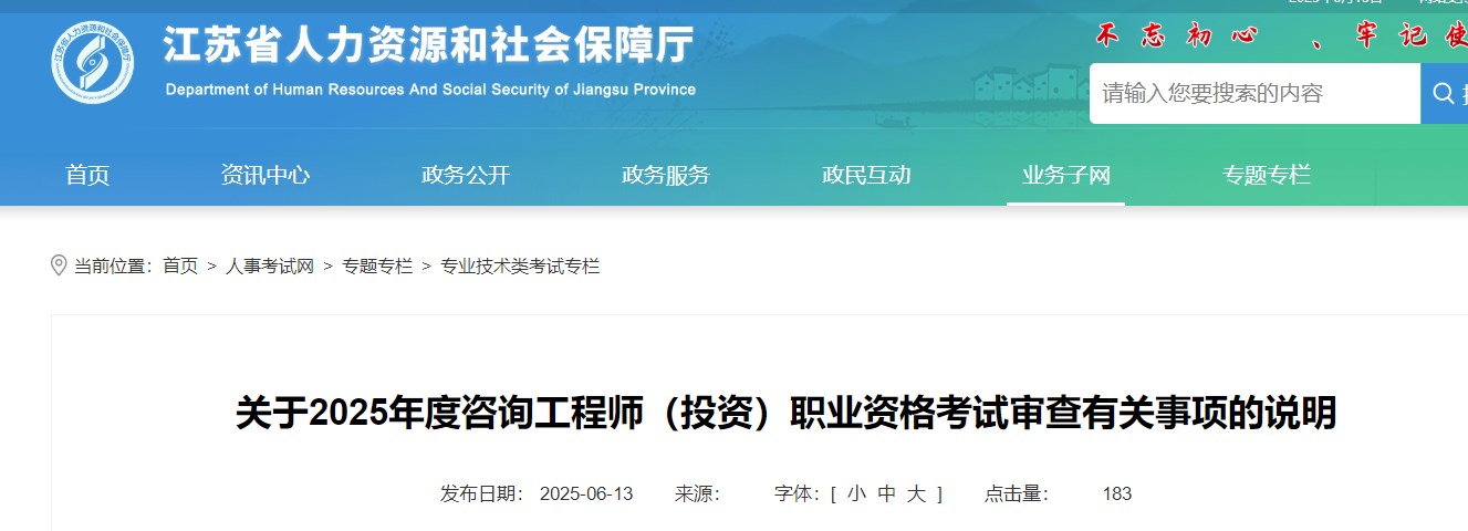 江蘇省人力資源和社會(huì)保障廳發(fā)布關(guān)于2025年度咨詢工程師(投資)職業(yè)資格考試審查有關(guān)事項(xiàng)的說明,具體信息如下: