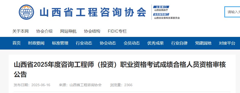 山西省工程咨詢協(xié)會(huì)發(fā)布山西省2025年度咨詢工程師(投資)職業(yè)資格考試成績合格人員資格審核公告,具體信息如下: