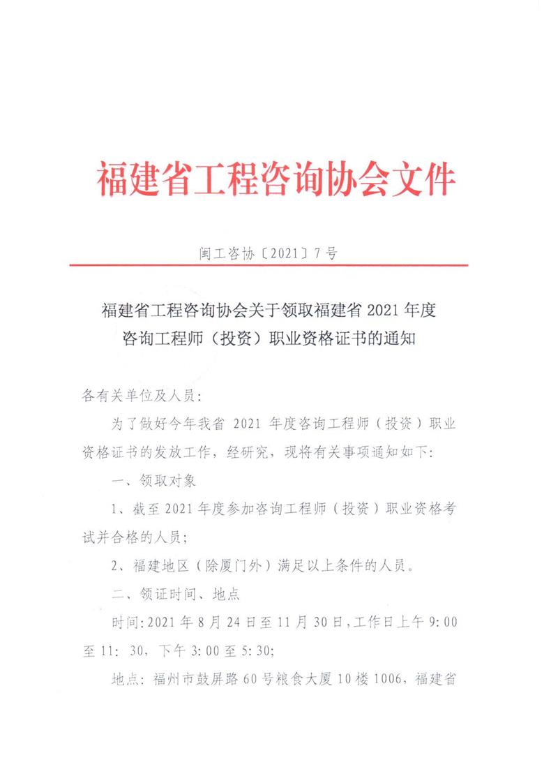 2021年度福建省領(lǐng)取咨詢工程師(投資)職業(yè)資格證書的通知