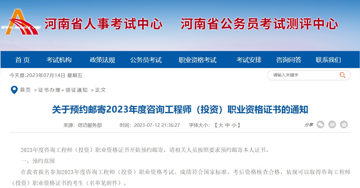 河南省人事考試中心發(fā)布《關(guān)于預(yù)約郵寄2023年度咨詢工程師(投資)職業(yè)資格證書的通知》,預(yù)約期為2023年7月13日至8月4日,逾期不申請,不再受理郵寄申請,詳情如下: