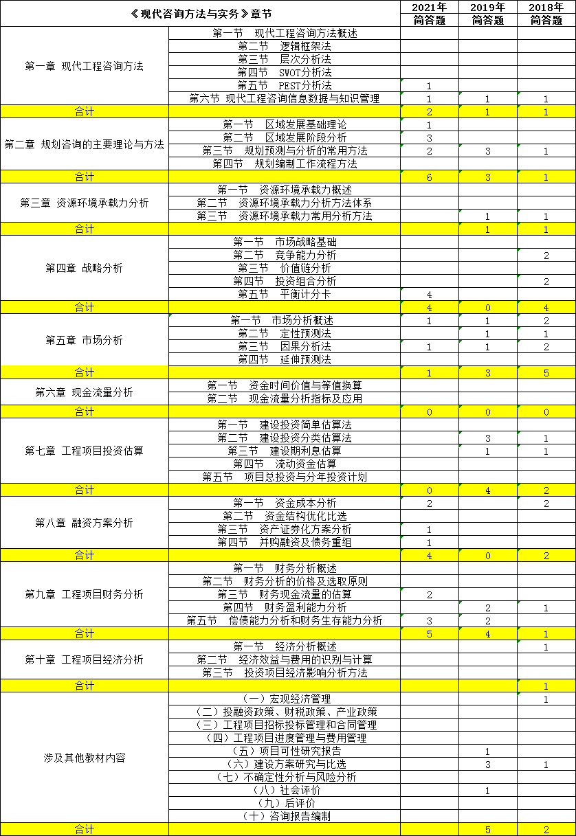 2018年-2021年咨詢工程師歷年試題在各科目章節(jié)中的分值分布占比,哪一章占比更重,哪一節(jié)每年都有考點?哪個部分學(xué)得不費力還容易拿分?都在這個表里了,抓住主要矛盾,備考才能事半功倍?。ú糠帜攴菡骖}缺失,無法進行整理,希望理解。)